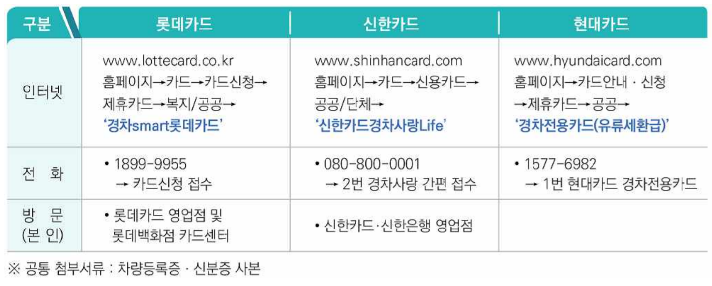 경차 유류세 환급을 받기 위해서는 롯데・신한・현대카드사에서 유류구매(신용・체크)카드를 발급받아야 한다.