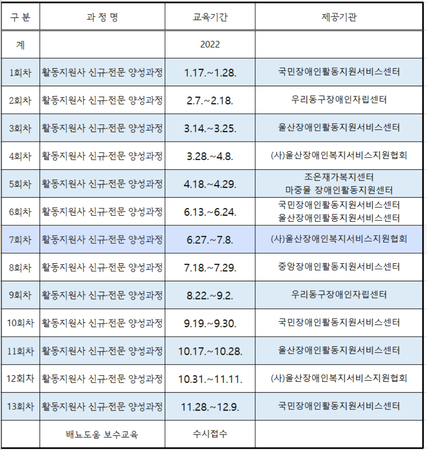 2022년 울산여성인력개발센터 활동지원사 양성 연간 교육일정