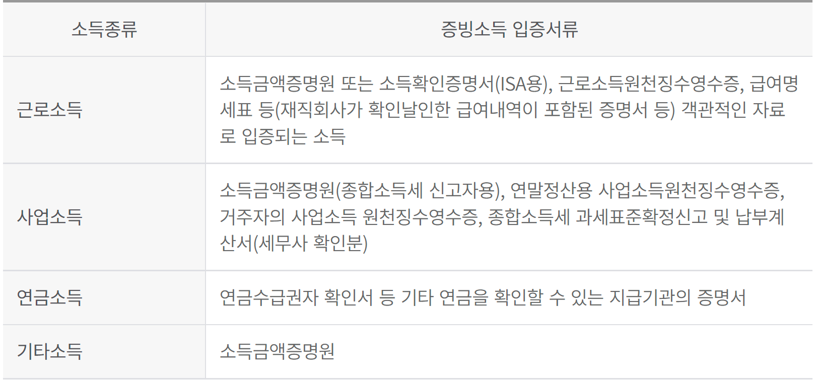 소득종류별 증빙소득 입증서류 (아래 서류 중 택1)