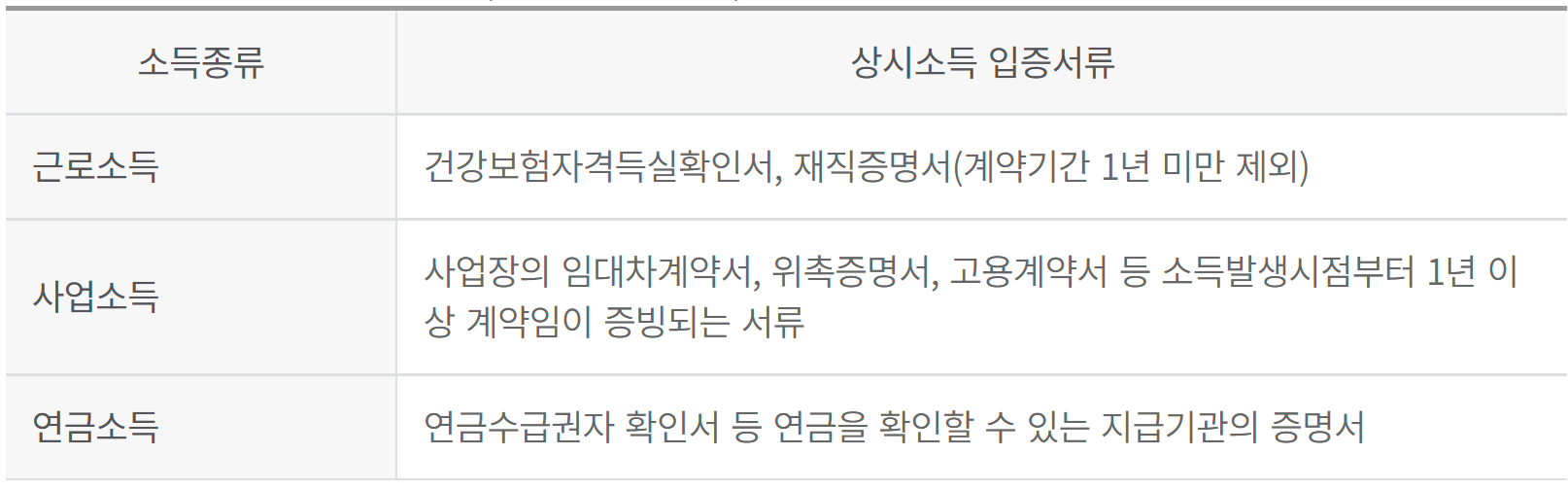 소득종류별 상시소득 입증서류 (아래 서류 중 택1)