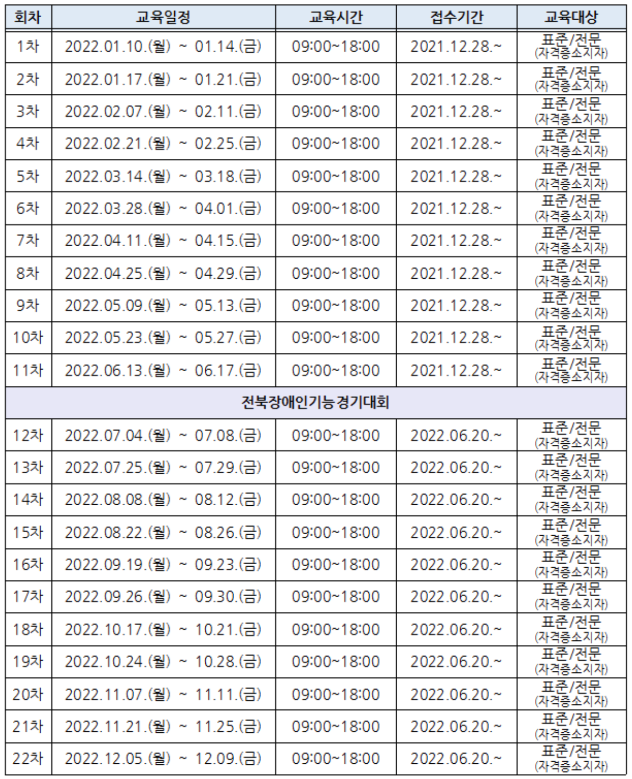 전북에 위치한 전라북도장애인복지관의 2022년 활동지원사 교육기관의 2022년도 교육일정이다.