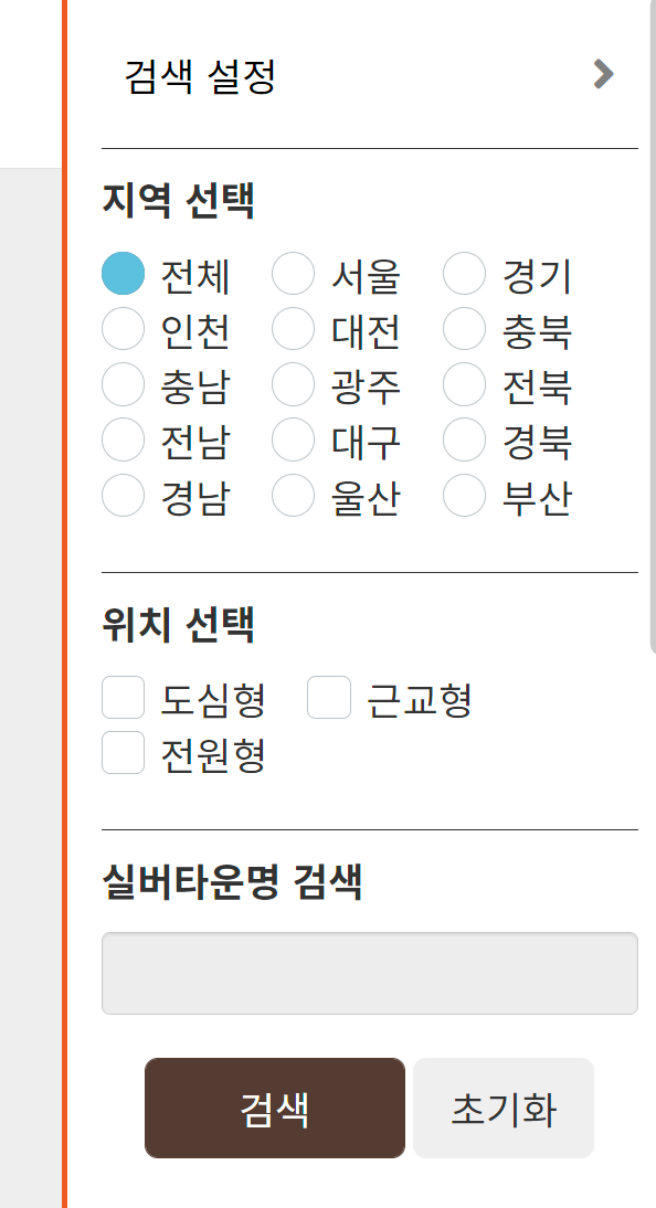 상단 검색 메뉴를 통해서 지역 및 유형별 검색 그리고 시설명을 통해서 검색을 할 수 있다.