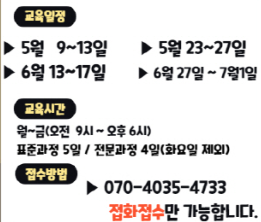 기본 : 월~금, 5일 수강(오전9시~오후6시), 교육비 15만원