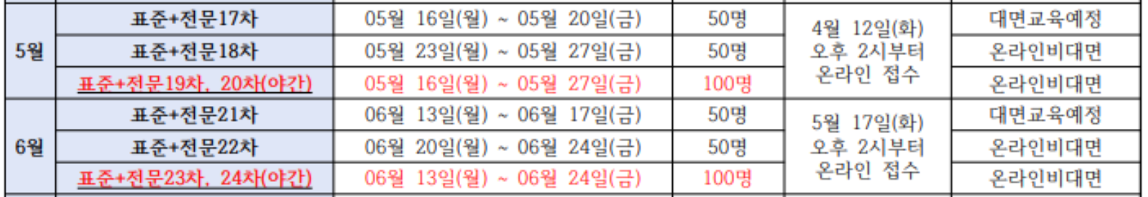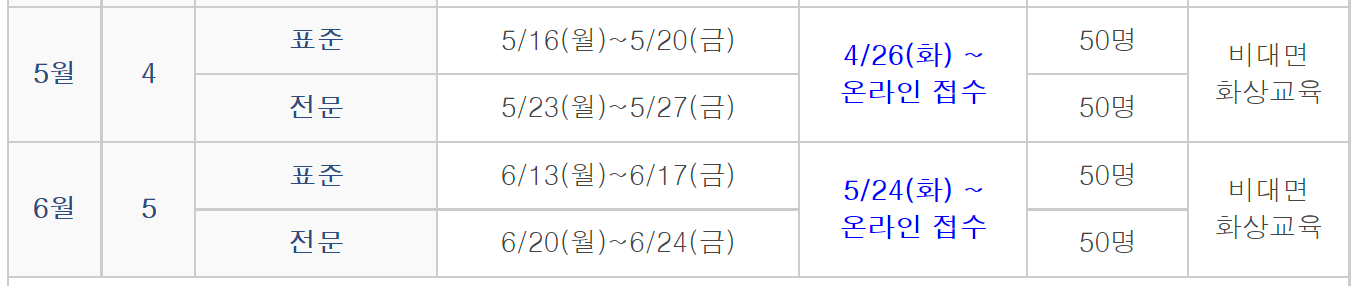| 2022년 5월((5월1차)) | 5월 9일(월)~13일(금) / 전문과정 12일(목) 제외 접수 : 4.15.(금)09:00~ 선착순으로 마감함 |
