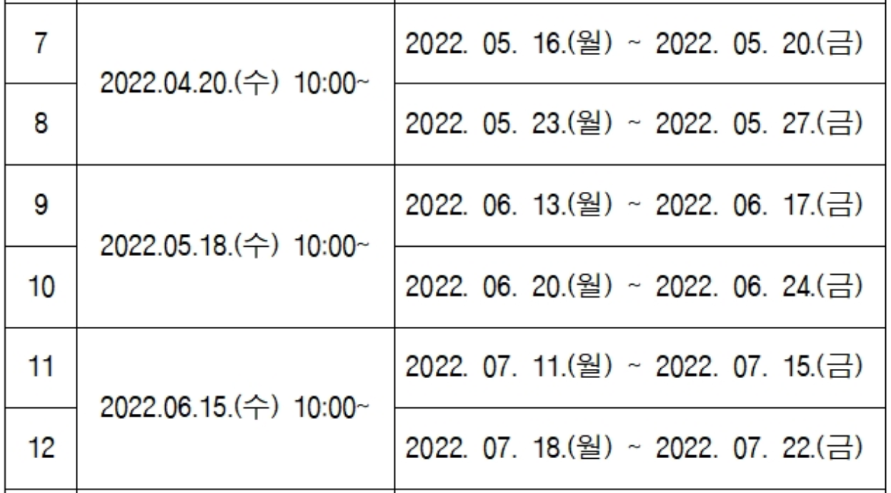 | 12회 | 2022년05월09일(월)~05월13일(금) 총 5일간 | 22년 05월 02일(월)~05월 06일 (금) 총 4일간 |