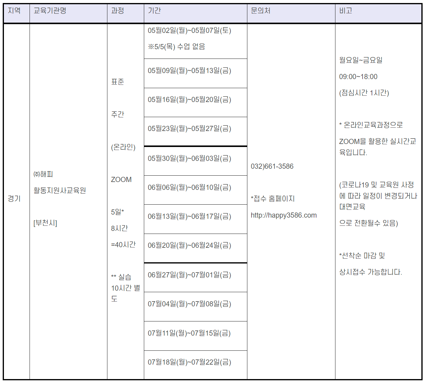경기지역에 위치한 장애인활동지원사 양성 교육기관의 2022년 5월 일정표이다. 해당 교육기관 사정에 따라 변경될 수 있다.