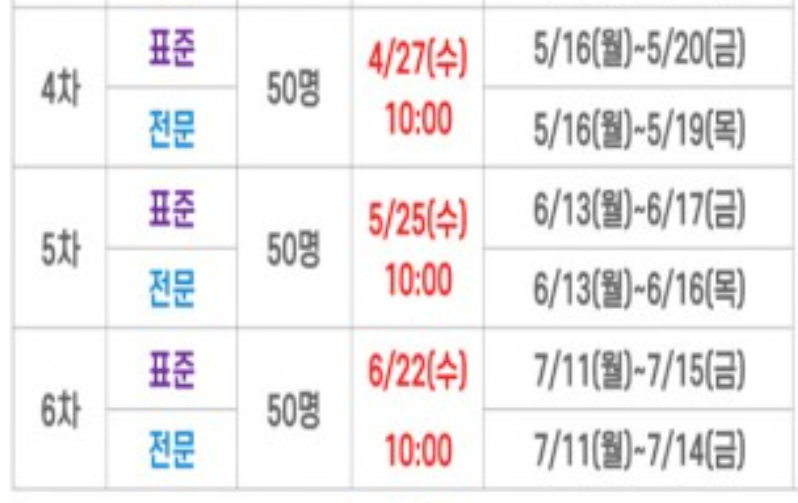 | 표준과정 | 4차 | 5.23.(월) ~ 5.27.(금) | 4.25.(월) |
