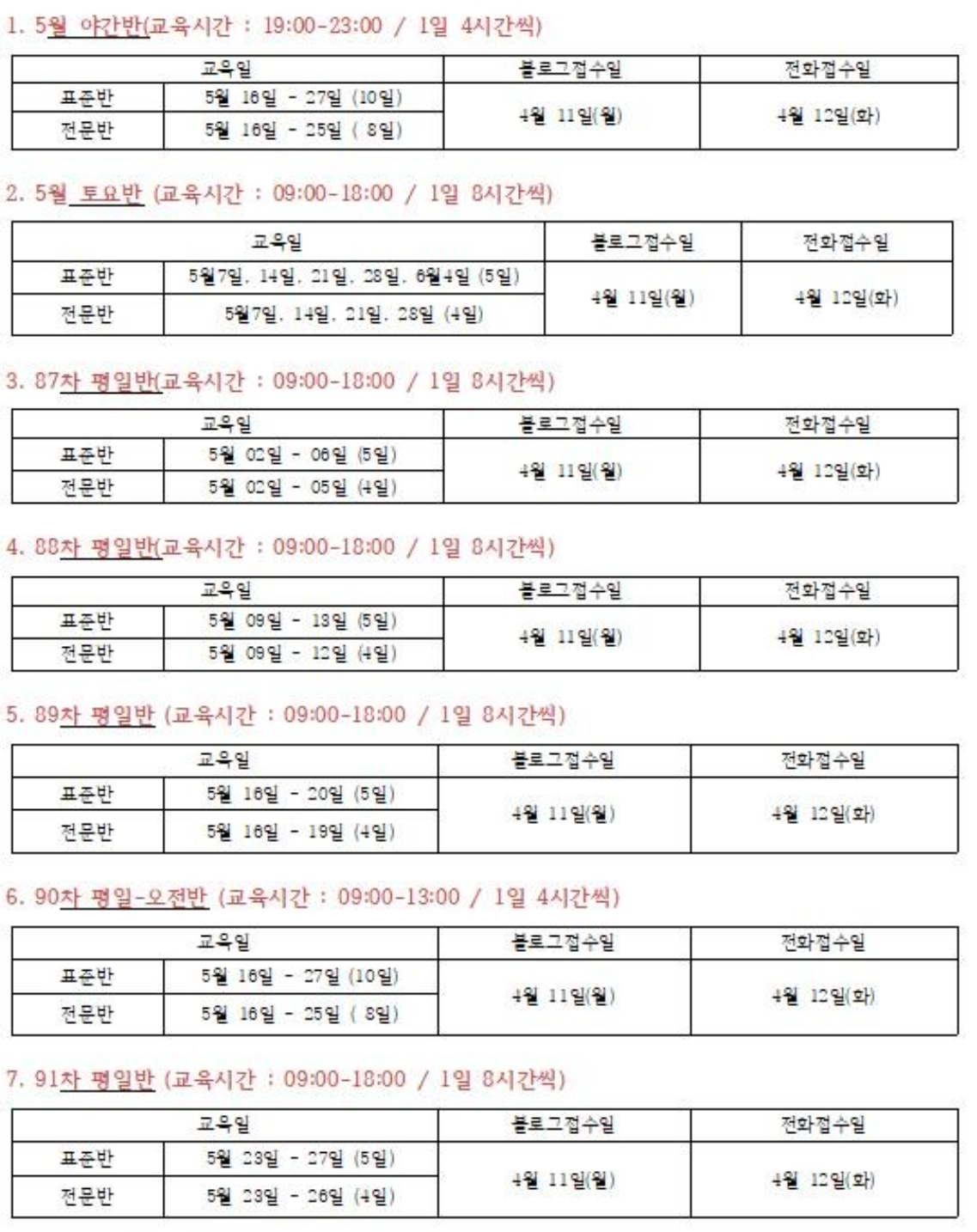 | 11회 | 토요반 4/30 5/7 5/14 5/21 5/28일반교육 총 5일간 | 토요반 4/30 5/7 5/14 5/21 유사교육 총 4일간 |