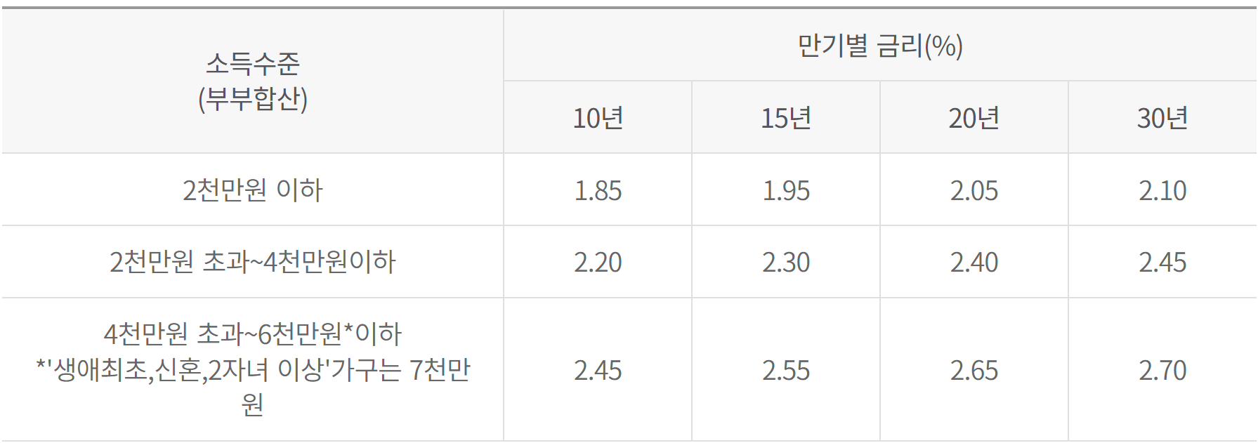 생애최초로 주택을 구입하는 신혼가구인 경우에는 아래 표의 금리 적용