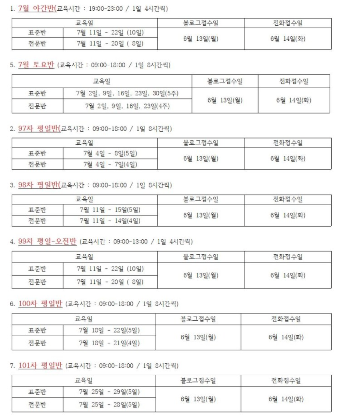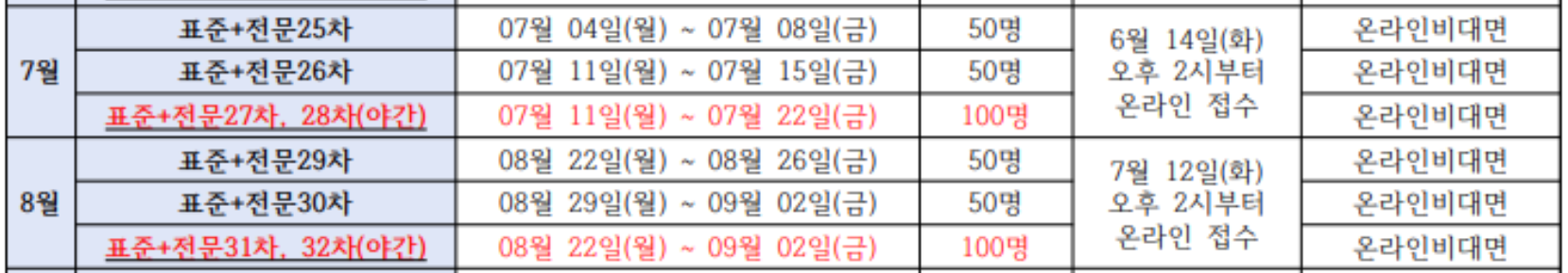 | 7월 | 6 | 표준 | 7/11(월)~7/15(금) | 6/21(화) ~ 온라인 접수 |