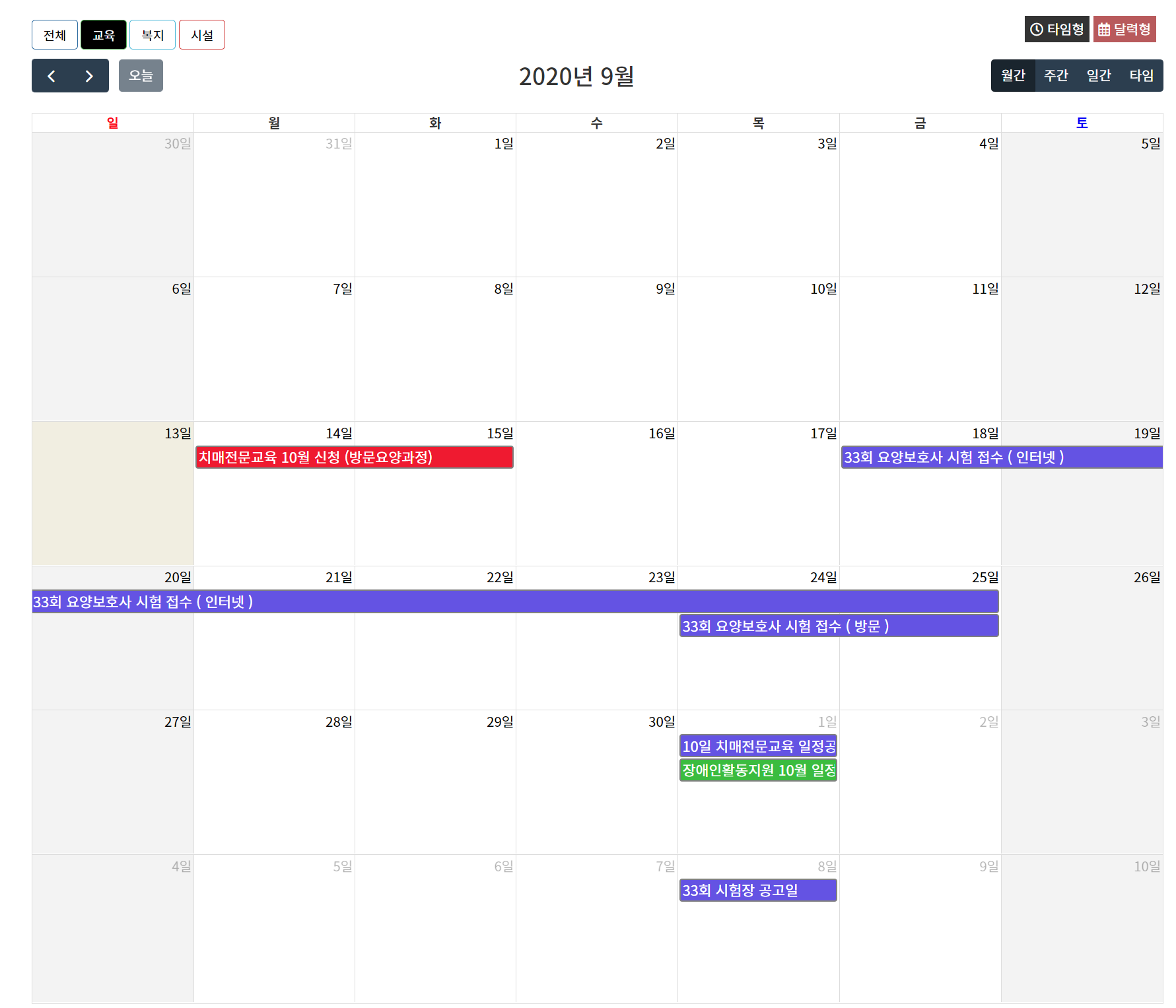 전체 카테고리를 누르면 교육, 복지, 기관(시설)의 모든 일정이 다 나옵니다.